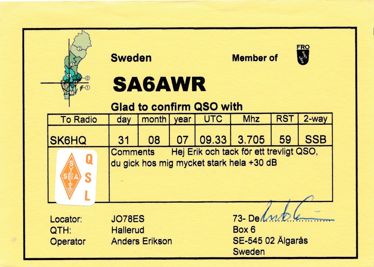 Ovanstående QSL är från en kontakt med SK6HQ i Karlsborg den 31 augusti 2007 på 3,705 MHz SSB med undertecknad som operatör. Jag hade passning på den frekvensen under några år, men där vi nu har arkivet går det inte få upp en antenn. Vi får satsa på remote!