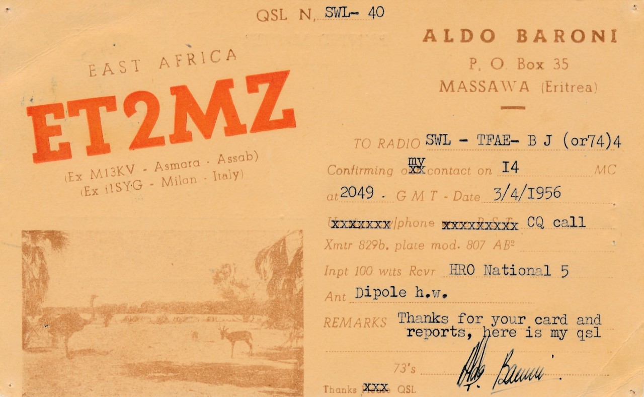 I avsaknad av ett QSL från Anna visar jag upp ett intressant kort från Eritrea, ET2MZ. Aldo Baroni hette operatören och han hade tidigare haft signalen MI3KV i Asmara och I1SYG hemma i Milano. Det var Per-Olow, SM5CZM, som hade hört Aldo den 3 april 1956 (exakt 60 år sedan) då han var medlem i Teknik för Allas lyssnarklubb. QTH var Massawa som är Eritreas hamnstad, c:a 8 mil nordost om Asmara. Klicka på korten så får ni detaljerna plus ett vackert frimärke med Haile Selassie (eftersom Eritrea då hörde till Etiopien).