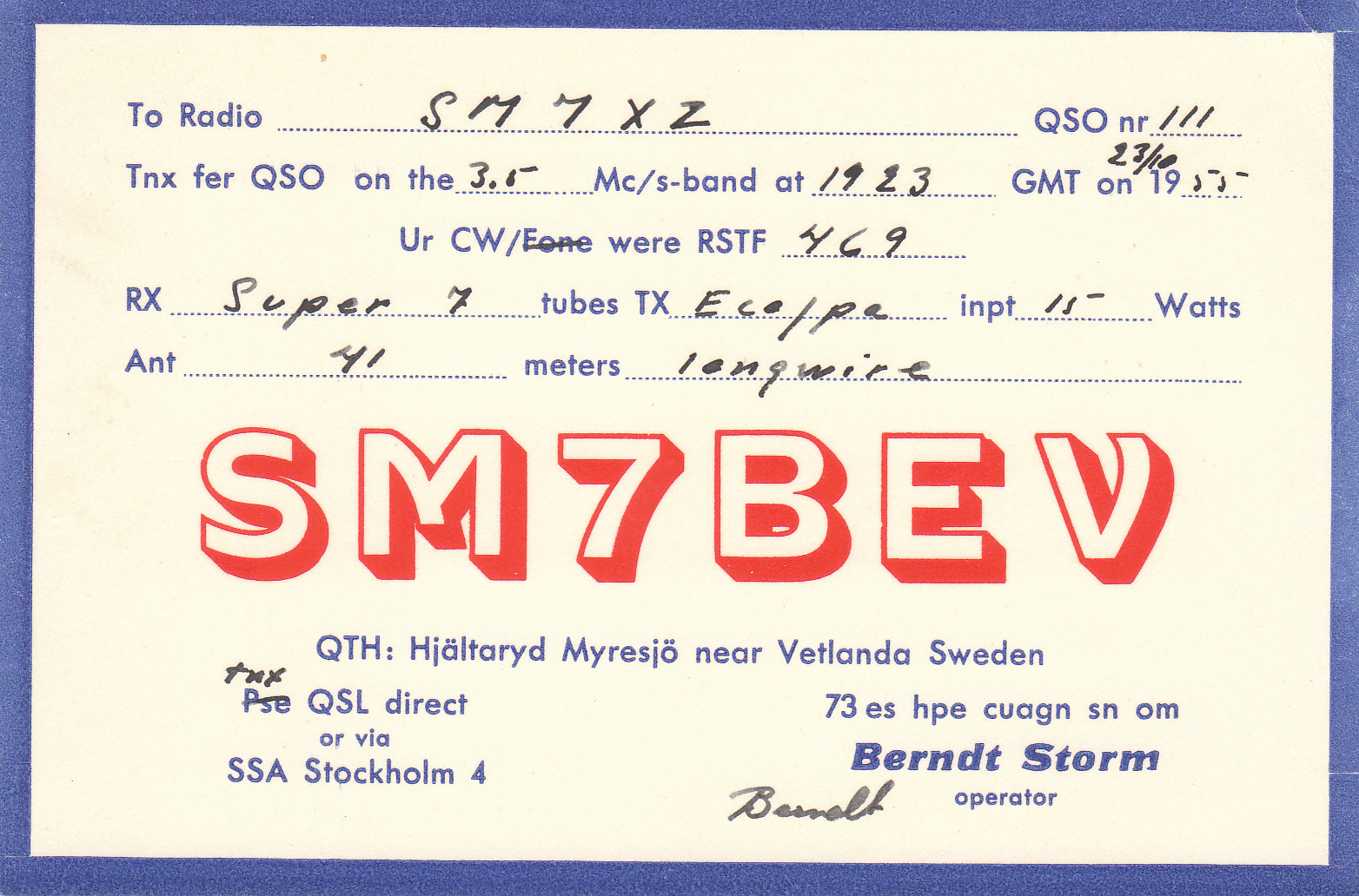 Torsdagen den 26 mars 2015 fyller Berndt Storm, SM7BEV, 85 år. Den 7 juni 1955 fick han sin signal och den 1 mars 1956 blev Berndt medlem i SSA. Vad jag kan utröna i arkivet så har Berndt bott i Hjältaryd ända till 2008, då han flyttade till Korsberga. Postadressen för Hjältaryd var till en början Myresjö, men ändrades 1976 till Landsbro. Alla dessa orter ligger i Vetlanda kommun. Berndts QSO #111 utspelades på 80 meter CW med Gunnar SM7XZ i Eslöv. Detta framgår av nedanstående QSL – klicka på kortet för en mycket tydligare bild.