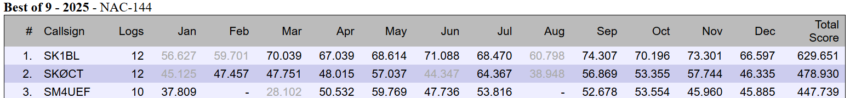 SK1BL vann överlägset årets NAC 144 MHz. Vi deltog samtliga 12 månadsomgångar från vår klubbstuga (JO97HK) och vann nio av dessa, de övriga kom vi tvåa. 11 av 12 omgångar vanns från SM1 då SM1FMT tog hem två månader från SK1BL VUSHF-QTH längst ut på södra Gotland (JO96BW).