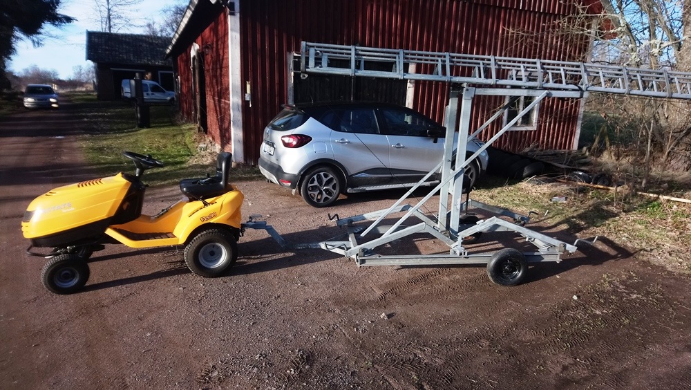 I höstas köpte jag en mastvagn på Tradera och jag och Fritte var och hämtade den utanför Borås. Sedan har den stått under vintern och jag har under vissa soliga dagar jobbat lite med den. Jag har smort upp alla linhjul och rörliga delar, bytt till två nya däck med mera. Nu idag på skärtorsdagen så sken solen och det var skönt ute så då var det fram med svetsen och dit med den nyinköpta dragkopplingen från Jula då den original bara har ett hål för krok på traktor. Nu kan jag flytta den lokalt med gräsklipparen och lite längre med bilen men tyvärr får inte dessa framföras på väg över huvud taget. Men lite kul antennexperiment med mera kommer jag att ha under vår och sommar och till vintern får den tjänstgöra som mittpunkt för en 160 meters antenn. Drömmen vore ju att ha en lite större pickup i garaget så man kan kunde ta bort hjulen och bulta fast ramen på flaket på den men det finns inte nu i alla fall så jag får nöja mig med att leka men den på de egna markerna. Höjden på masten fullt uppvevad är 12 meter och sedan tillkommer ju längden på de maströr som man monterar på.