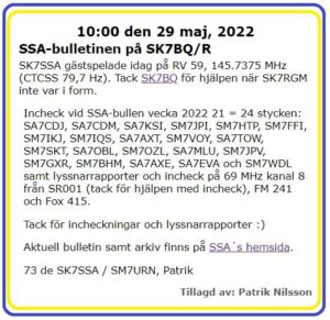 Solen strålar i ett vintrigt Sölvesborg, och vi blev 45 noterade incheckare vid dagens SSA-bulletin över SK7RGM. Tack för att ni checkar in och medverkar på olika sätt Grattis till dagens födelsedagsfirare samt namnsdagsjubilarer som är Pontus och Marina. En fortsatt fin söndag och bra…