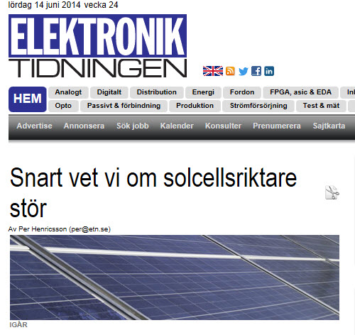 Hans-Christian SM6ZEM i Lysekil tipsar om en artikel i Elektroniktidningens webbupplaga. Artikeln handlar om hur PTS och motsvarande myndigheter i några andra länder i sommar granskar solcellsriktare. Studien ska vara avslutad den 30 juni.