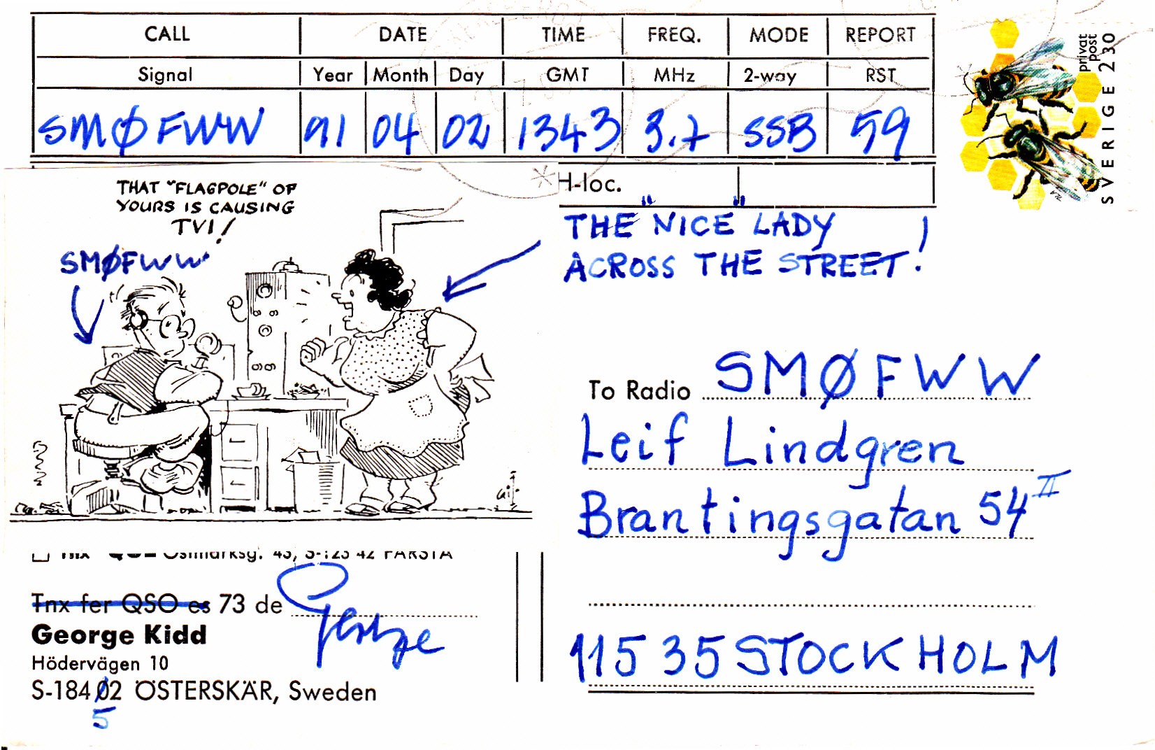 Torsdagen den 24 mars firar vi George Kidd, SMØKVN, som fyller 92 år. Han blev medlem i SSA den 20 november 1969 och bodde då på Artillerigatan inne i centrala Stockholm. Det dröjde ganska exakt tio år innan T-certifikat #15164 skrevs ut den 7 november 1979, och då hade George flyttat ut till Österskär, två mil nordost om Stockholm; fågelvägen. Vintern 2006-07 flyttade George dryga 2 km norrut, till Åkersberga, där han fortfarande bor. Vad som hänt sedan förra året är att George flyttat ut till c:a 2,5 km norr om centrum (fågelvägen). QSL-kortet är från ett QSO på 80 meter SSB med Leif SMØFWW (numera SM5) som den 21 september 1991 befann sig på Åland (OHØ).