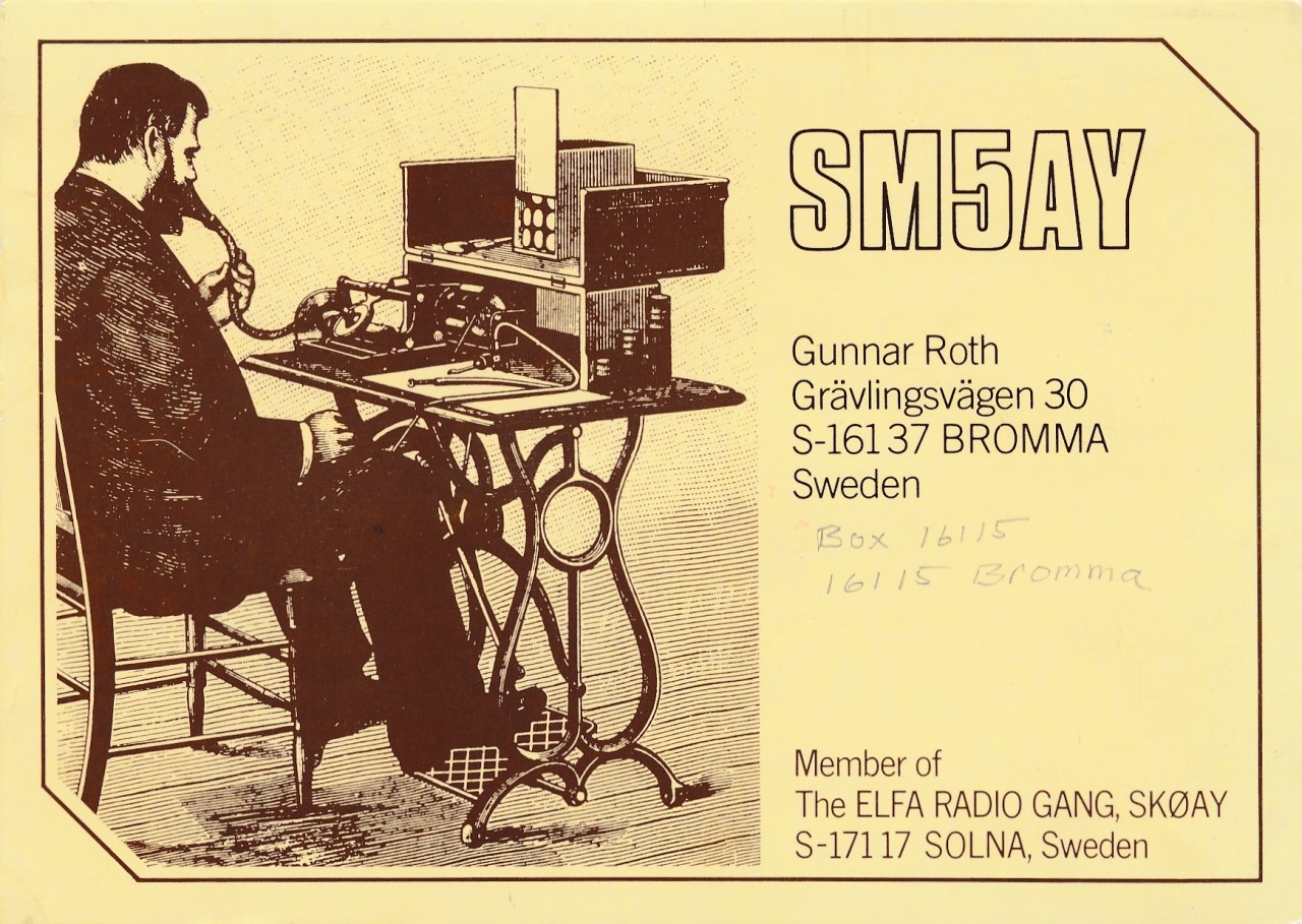Jag visar även ett betydligt nyare QSL-kort. Det måste vara från omkring 1970 (inget datum är utsatt), eftersom Gunnar då bodde på den här adressen i Bromma.