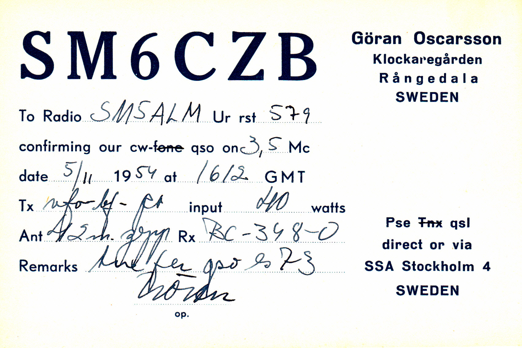 Samma dag som Annika föddes hade SM6CZB, Göran i Rångedala, ett QSO med SM5ALM på 80 meter CW. Hans SM5ALM var enligt Televerkets callbook från 1954 flygsignalist i Västerås. Hans avled 2011, då boende i Fjälkinge (Skåne).