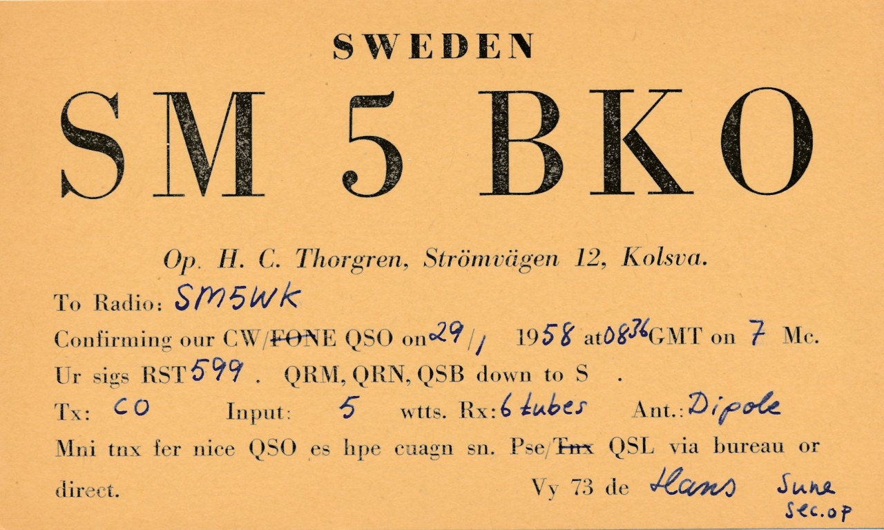 Torsdagen den 13 oktober 2016 kan vi fira en f.d. ordförande i SSA, Hans Thorgren, Västerås, SM5BRW, som fyller 75 år. Hans första anropssignal var SM5BKO och den är med i Televerkets Författningssamling E:22 för första gången i utgåvan av den 15 mars 1958 och han blev medlem i SSA den 3 maj. Hans är enligt Telestyrelsen född i Stockholm, men som 17-åring bodde han i Kolsva, 30 meter från Hedströmmen som rinner genom denna ort i Köpings kommun. QSL-kortet här ovan är från den 29 januari 1958, då Hans hade ett QSO med SM5WK Henry, som då bodde i Sundbyberg. Om ni klickar på kortet ser ni fler detaljer, t.ex. att det kan ha varit en second operator med på QSO:t; det står i alla fall ”Sune sec.op” i nedre högra hörnet. Ytterligare en adress figurerar i Kolsva innan Hans flyttar till Västerås vintern 66-67, där han därefter blir kvar, från 1983 på nuvarande adress. Studier/karriär/familj orsakade ett avbrott i amatörradion 1967-73, och på den tiden hade det konsekvenser i form av att man tappade sin signal. När Hans kommer tillbaka är det som SM5BRW; A-certifikat #5359 av den 28 juni 1973. Den 8 augusti gick han åter in i SSA, och kom omgående i gång med amatörradio igen. Beviset är kortet här nedan från den 8 december 1973, då Hans hade lokal-QSO med Urban SM5BTX, en mycket välkänd Västeråsprofil (SK 2011). Hans arbetade inom skolan i Västerås, och var rektor vid pensioneringen. Han var aktiv inom den lokala klubben och åren 1990-92 ordförande i SSA efter en ganska turbulent period i vår 91-åriga historia. Hans har även därefter varit behjälplig, bl.a. genom att framställa SSA:s Antennkompendium under många år. Vi gratulerar dig hjärtligt på födelsedagen Hans!