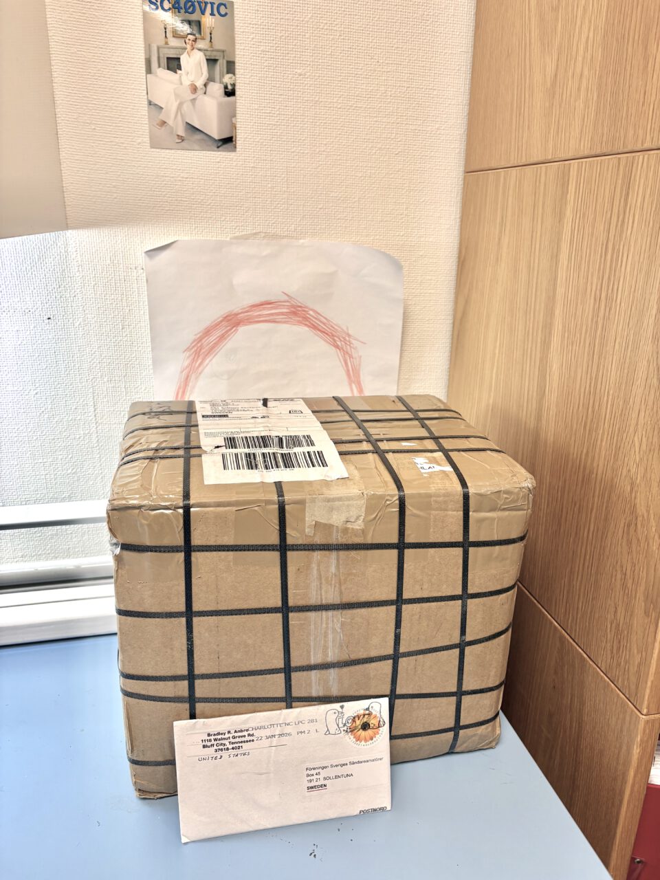 Sålunda inväntar, förutom SM1:s= 0.95 kg i en postnordpåse, postad före e.m.-tömning samma dag, SM2= 4, SM3= 4, SM4= 3, SM5= 4, SM6= 6, SM7= 4 samt JSM= 3 kg, att postnord hämtar när Thérése fixat frakthandlingar och beställt transport.