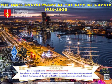 Fram till den 22 februari är SP100G, SQ100D, SO100Y, SN100N, HF100I samt 3Z100A QRV för att fira Östersjöstaden Gdynias 100-årsjubileum. Kör ihop ett antal QSO och ladda ned deras tjusiga diplom från https://ot09.pzk.org.pl/akcje/100gdynia/100gdy.php SP100G har f.ö. trevligt nog hörts en del på gammal hederlig RTTY,…