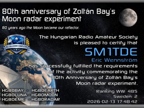 Kör alla HG80-stationerna som listas på diplomet och använd minst två olika trafiksätt så är diplomet ditt att ladda ner från: Zoltán Bay Moon Radar 80th Anniversary Activity Aktiviteten pågår månaden ut. Från QRZ.com: Zoltán Bay Moon Radar 80th Anniversary Activity Radiaoamateurs all around the…