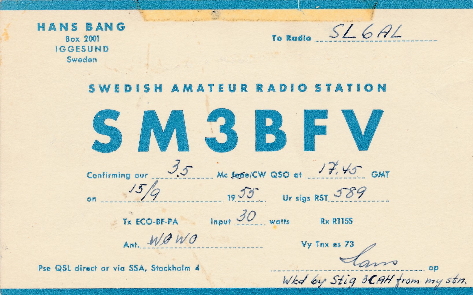 Inget QSL från Inge, så vi visar i stället ett kort som är resultatet av ett QSO mellan Hans SM3BFV i Iggesund (SK 2012) och S2 i Karlsborg, SL6AL, den 15 september 1955, alltså idag exakt 60 år sedan. Det var dock Stig SM3CAH (nu SM5) som satt vid telegrafinyckeln under detta QSO enligt anteckning av Hans längst ner till höger på kortet.