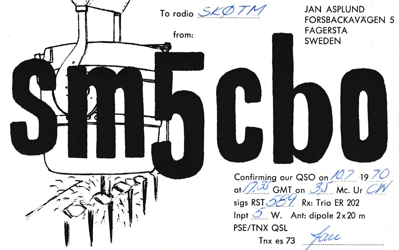 70 år fyller Jan Asplund, SM4CBO, Smedjebacken. Medlem i SSA blev Jan den 8 september 1967 som SM5CBO och första gången han är med i en callbok är E:22an av den 15 februari 1968. Jan bodde i Fagersta, men 1974 flyttade han drygt 3 mil mot nordväst till Morgårdshammar som nu är en del av tätorten Smedjebacken (som har drygt 5000 invånare). Sedan 1976 bor Jan på nuvarande adress. QSL-kortet här nedan är från den 10 juli 1970 då Jan fortfarande bodde i Fagersta. QSO med SKØTM på 80 meter CW.