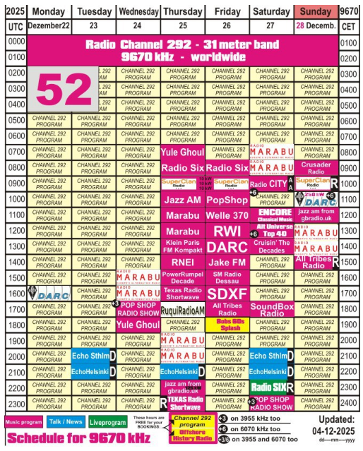 - Maratonsändning: 25 och 26 december mellan 08.00 och 24:00 svensk tid på 9670 kHz.
