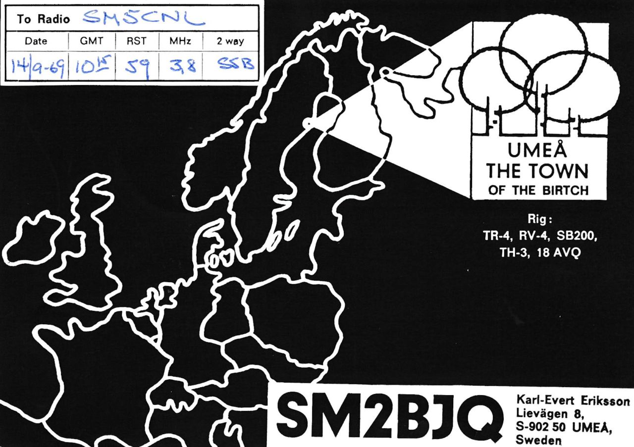 Karl-Evert Eriksson, SM2BJQ, Umeå, fyller 80 år. Han blev lyssnarmedlem redan den 2 april 1952 som SM2-2535. Karl-Evert bodde i den lilla byn Gullsjö, postort Tväråbäck, som är belägen c:a fyra mil nordväst om Umeå. Första omnämnandet som SM2BJQ är i callboken av den 1 juni 1960. I januari 1965 meddelade Karl-Evert att han flyttat ner till Umeå och på Lievägen bodde han till bara ett par år sedan. På Google Earth Street View ser man fortfarande en 4-elements beam på taket på Lievägen 8, och på nuvarande adress är det på Google Earth bara mark, m.a.o. helt nybyggt. QSL-kortet har vi fått från Olov SM5CNL (SK 2011) som den 14 september 1969 hade QSO med Karl-Evert på 80 meter SSB.
