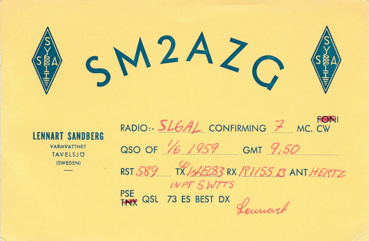 Lennart Sandberg, SM2AZG, fyller 75 år. Han blev medlem i SSA den 2 april 1959, 17 år gammal, då boende i Varmvattnet, ett par kilometer norr om Tavelsjö och c:a tre mil nordväst om Umeå. På hösten 1961 flyttade Lennart till Enskede söder om Stockholm, och därefter följde 20 år med ganska många adresser i Stockholm, Södertälje, Skärholmen och Enhörna. 1982 återvände Lennart till Tavelsjö och där bor han fortfarande. Om man skriver in adressen i Google Earth Street View ser man ett antal antenner, både på taket och gräsmattan! QSL-kortet är från ett QSO med Karlsborgs stolthet SL6AL den 1 juni 1959 på 40 meter CW. Om ni klickar på kortet ser ni tydligt att Lennarts station bestod av TX CO EL83, RX 1155B och en Hertz-antenn. Inpt 5 wtts.