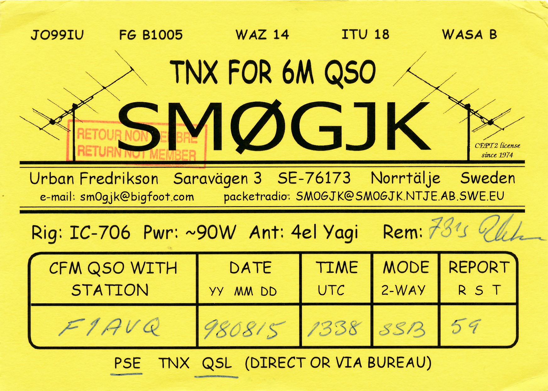 Tisdagen den 10 november 2015 firar vi Urban Thärn, SMØGJK, som fyller 60 år. Enligt Televerket är han född i Skön, strax norr om Sundsvall. Sitt T-certifikat #10834 skrevs ut den 29 maj 1974 och han blev medlem den 11 februari 1975 som SM3GJK, Urban Fredrikson, då boende i Gävle. Ett antal år senare flyttade Urban till Norrtälje och bor sedan dess i byn Svanberga en knapp mil norr om Norrtälje. Som framgår av QSL-kortet hade han den 15 augusti 1998 ett QSO med F1AVQ på 6 meter SSB, men tydligen var F1AVQ inte medlem i REF så kortet kom tillbaka och hamnade i SSA:s arkiv i stället. Det är det enda kort jag hittat från Urban än så länge så – tack för det!